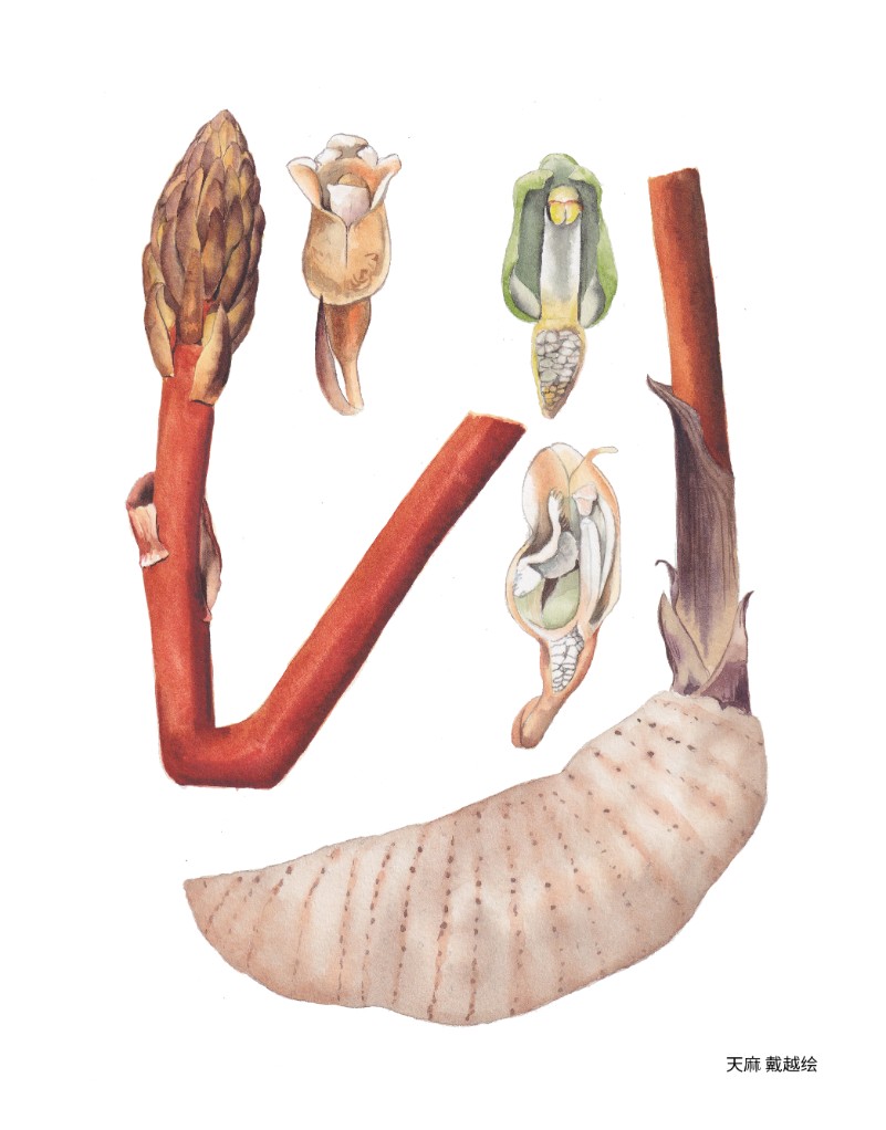 天麻是兰科天麻属植物,又名神草、赤箭、白龙皮、山地瓜等 。植株高30-100厘米,有时可达2米;根状茎肥厚,块茎状,椭圆形至近哑铃形,肉质;茎直立,橙黄色、黄色、灰棕色或蓝绿色,无绿叶,下部被数枚膜质鞘。总状花序长5-30(-50)厘米,通常具30-50朵花;蒴果倒卵状椭圆形,长1.4-1.8厘米,宽8-9毫米。花果期5-7月。