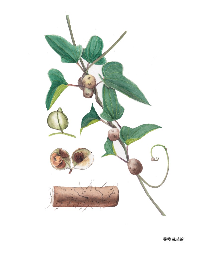 薯蓣(学名:Dioscorea polystachya Turcz.)是缠绕草质藤本。块茎为长圆柱形,垂直生长,长可达1米多,断面干时白色。茎通常带紫红色,右旋,无毛。单叶,在茎下部的互生,顶端渐尖,基部深心形、宽心形或近截形,边缘常3浅裂至3深裂。叶腋内常有珠芽。雌雄异株。雄花序为穗状花序,近直立;花序轴呈“之”字状,苞片和花被片有紫褐色斑点。蒴果不反折,三棱状扁圆形或三棱状圆形,外面有白粉;种子着生于每室中轴中部,四周有膜质翅。花期6—9月,果期7—11月。